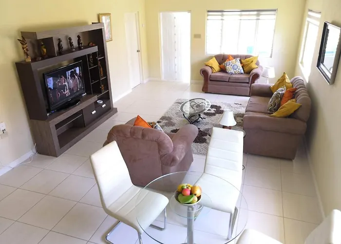 La villa de 12 m^2 Juds Vacation Home In Hartlands Estate, Priory Ja se trouve à 10 minutes de marche de Priory public beach et à moins de 10 minutes de Richmond Estate Beach. Un espace de repas, un canapé et un bureau sont disponibles dans ces chambres de la villa.